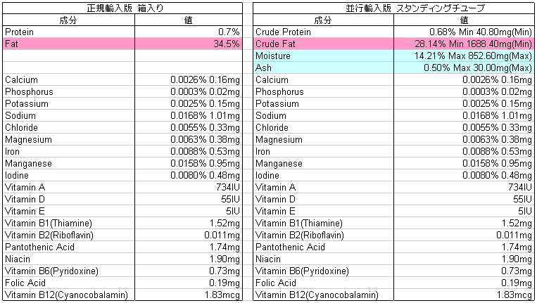 目立った違いは、脂肪分の量と並行輸入版にはMoistureとAshが含まれているところでしょうか。